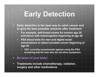 Screening mammograms usually involve two or more x-ray pictures or images of each breast. Regular screenings are the best way to detect cancer early when it is easier to treat. The American Cancer Society advises men to be aware of testicular cancer and to see a doctor right away if they find a lump in a testicle.